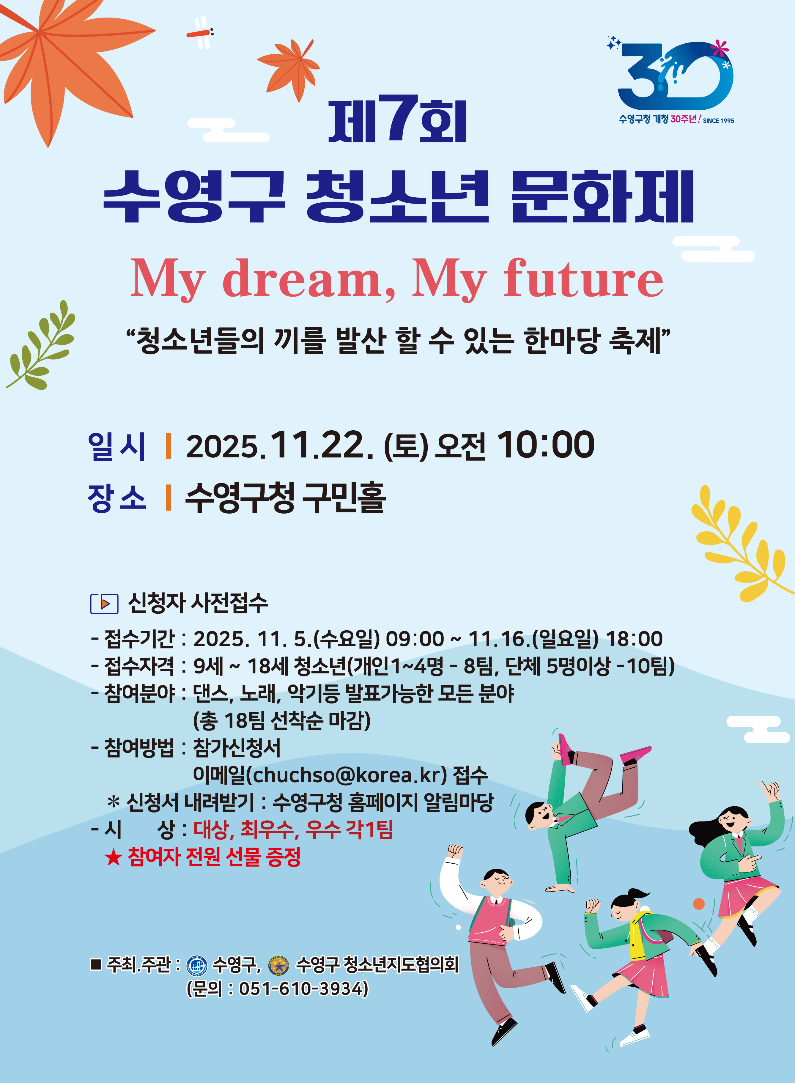 제7회 수영구 청소년 문화제 신청자 접수제7회 수영구청소년 문화제(My dream, My future) - 행사일시 : 2025. 11. 22.(토) 오전 10시- 접수기간 : 2025. 11. 5.(수) 09시 ~ 11. 16.(일) 18시까지,선착순 마감- 장 소 : 수영구청 2층 구민홀- 대 상 : 9~18세 청소년 누구나 총 18팀(개인1~4명 8팀/ 단체5명 이상 10팀)- 참여방법 : 신청서 이메일(chuchso@korea.kr)- 문 의 : 수영구 청소년지도협의회(051-610-3934) 2025.1021