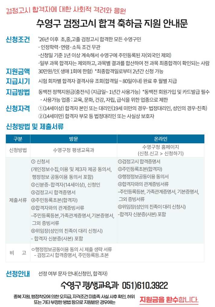 - 신청조건 : '26년 이후 초,중,고졸 검정고시 합격한 모든 수영구민 - 인정학력·연령·소득 조건 무관 -신청일 기준 1년 이상 계속해서 수영구에 주민등록된 자(외국인 제외) -일부 과목 합격자는 제외하고, 과목별 결과를 합산하여 전 과목 최종합격이 확인되는 사람 -일부 과목 합격자는 제외하고, 과목별 결과를 합산하여 전 과목 최종합격이 확인되는 사람