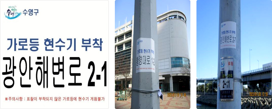 가로등 현수기 부착 가능 구역 표지 및 현장 사진 예시