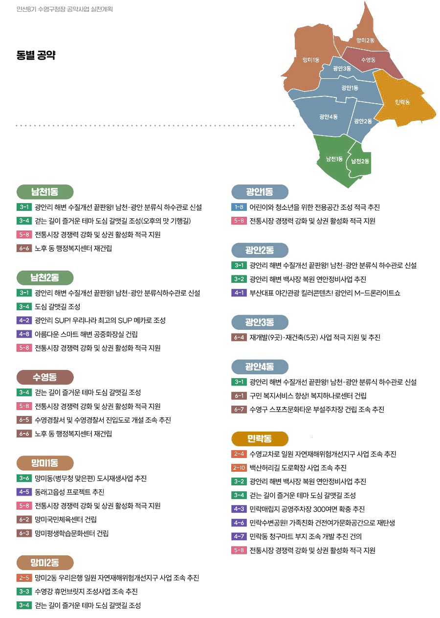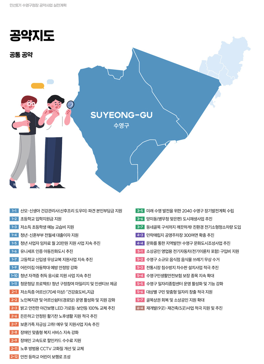 1-1 산모·신생아 건강관리사(산후조리 도우미) 파견 인부담금 지원 1-2 초등학교 입학지원금 지원 1-3 저소득 초등학생 예능 교습비 지원 1-4 청년·신혼부부 전월세 대출이자 지원 1-5 청년 사업자 임차료 월 20만원 지원 사업 지속 추진 1-6 유니세프 인증 아동친화도시 추진 1-7 고등학교 신입생 무상교복 지원사업 지속 추진 1-8 어린이와 청소년을 위한 전용공간 조성 적극 추진 1-9 어린이집 아동학대 예방 안전망 강화 1-10 청년 자격증 취득 응시료 지원 사업 지속 추진 1-11 청문청답 프로젝트! 청년 구정참여 마일리지 및 인센티브 제공 2-1 저소득층 어르신(70세 이상) 「건강효도비」 지급 2-2 노인복지관 및 어르신쉼터(경로당) 운영 활성화 및 지원 강화 2-3 밝고 안전한 야간보행 LED 가로등·보안등 100% 교체 추진 2-4 수영교차로 일원 자연재해위험개선지구 사업 조속 추진 2-5 망미2동 우리은행 일원 자연재해위험개선지구 사업 조속 추진 2-6 든든하고 안정된 활기찬 노후생활 지원 적극 추진 2-7 보훈가족 자긍심 고취! 예우 및 지원사업 지속 추진 2-8 장애인 맞춤형 복지 서비스 지속 강화 2-9 장애인 고속도로 할인카드 수수료 지원 2-10 백산허리길 도로확장 사업 조속 추진 2-11 노후 방범용 CCTV 고화질 개선 및 교체 2-12 안전 등하교 어린이 보행로 조성 3-5 미래 수영 발전을 위한 2040 수영구 장기발전계획 수립 3-6 망미동(병무청 맞은편) 도시재생사업 추진 3-7 동네골목 구석까지 깨끗하게! 친환경 전기소형청소차량 도입 4-3 민락매립지 공영주차장 300여면 확충 추진 4-4 문화를 통한 지역발전! 수영구 문화도시조성사업 추진 5-1 소상공인 영업용 전기차(전기이륜차 포함) 구입비 지원 5-2 수영구 소규모 음식점 음식물 쓰레기 무상 수거 5-3 전통시장 침수방지 차수판 설치사업 적극 추진 5-4 수영구민 생활안전보험 보장 종목 지속 확대 5-5 수영구 일자리종합센터 운영 활성화 및 기능 강화 5-6 대상별 구민 맞춤형 일자리 창출 적극 지원 5-7 골목상권 회복 및 소상공인 지원 확대 6-4 재개발(9곳)·재건축(5곳)사업 적극 지원 및 추진